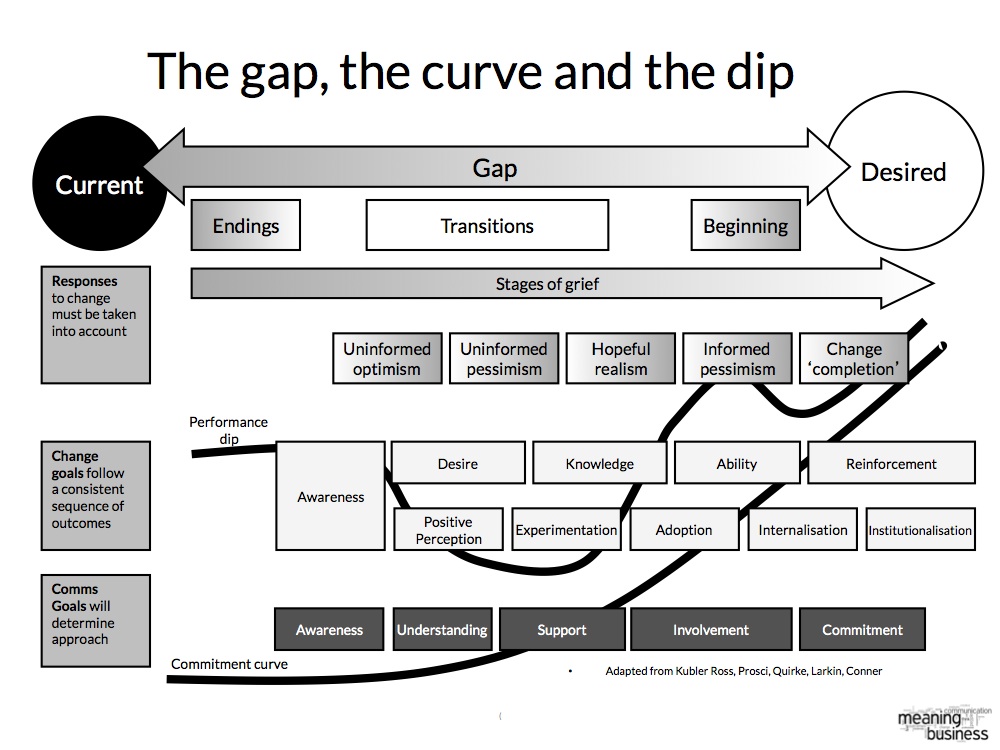 The study points to the non-linear nature of transformation, and proposes that the curve has outlived its usefulness do to the degree of concurrent change within organisations. Here I am taking on the change curve’s right of reply. I would argue that it the change curve is the only model comms and leadership use for managing change, they are doing it wrong.