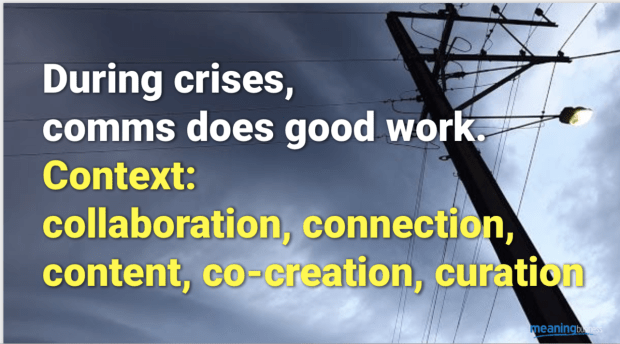 My personal belief is that it’s not the right time to be making hard or universal predictions on what’s next. Instead, here’s a framing tool to consider what to keep and what to leave behind. It’s an exercise I’ve used in other settings and it’s got great potential for asking ourselves and our organisations two questions as we move to whatever ‘next’ is. In this 16 minute discussion, I look at why there is no ‘new normal’, at how communicators can use this time as a way of making choices about their practice and in how that same approach can apply to the communication industry more broadly. I’d love to know your thoughts and to continue the conversation.