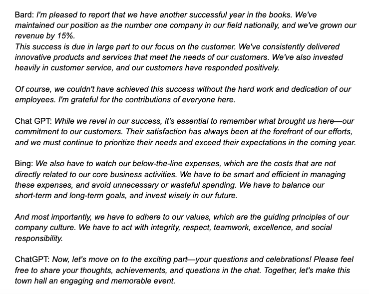 This text is an example of what the three leading generative AI chat engines produced following this request: