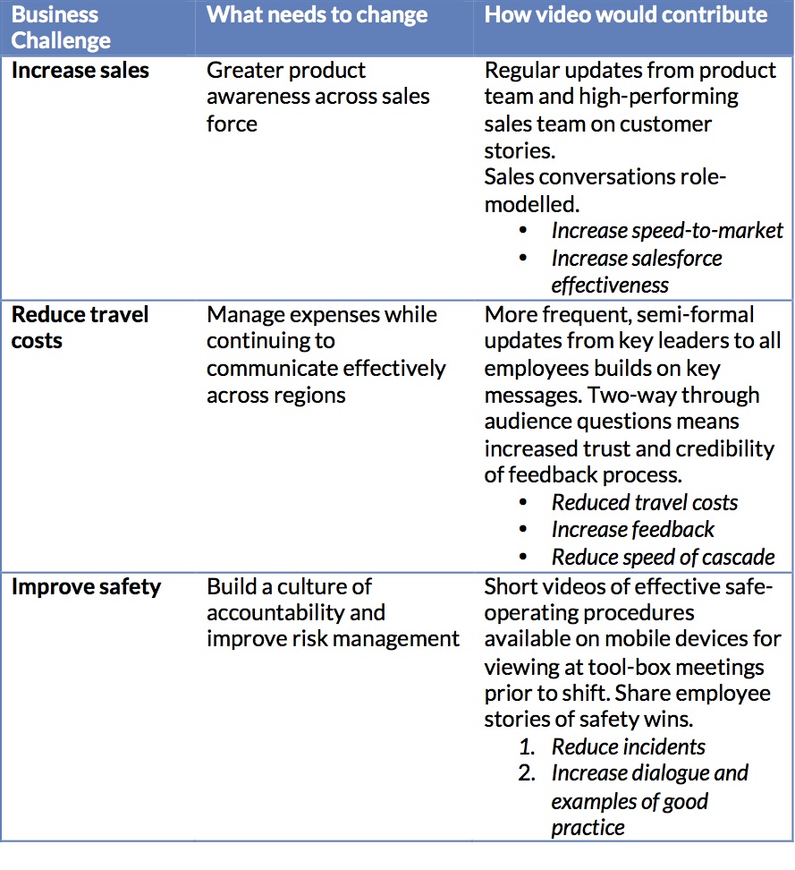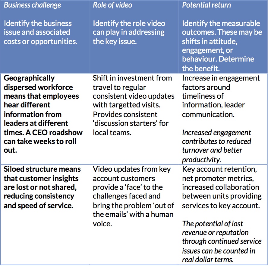Video is an iterative channel. It grows and evolves with your overall business strategy. Great stories have a way of capturing people’s attention. If you find the right opportunity and take a strategic approach, people will take notice. You can transform a tactic – a broadcast, a leader message, an employee story – into a powerful strategic tool. Taking a planned approach to building the case and demonstrating the outcomes is the first step in making video an integral part of your engagement agenda and delivering valued outcomes to your business.